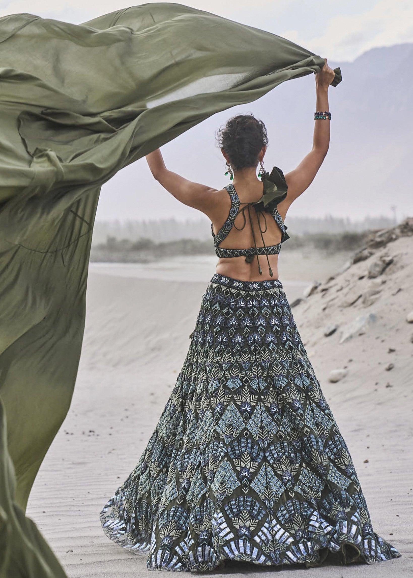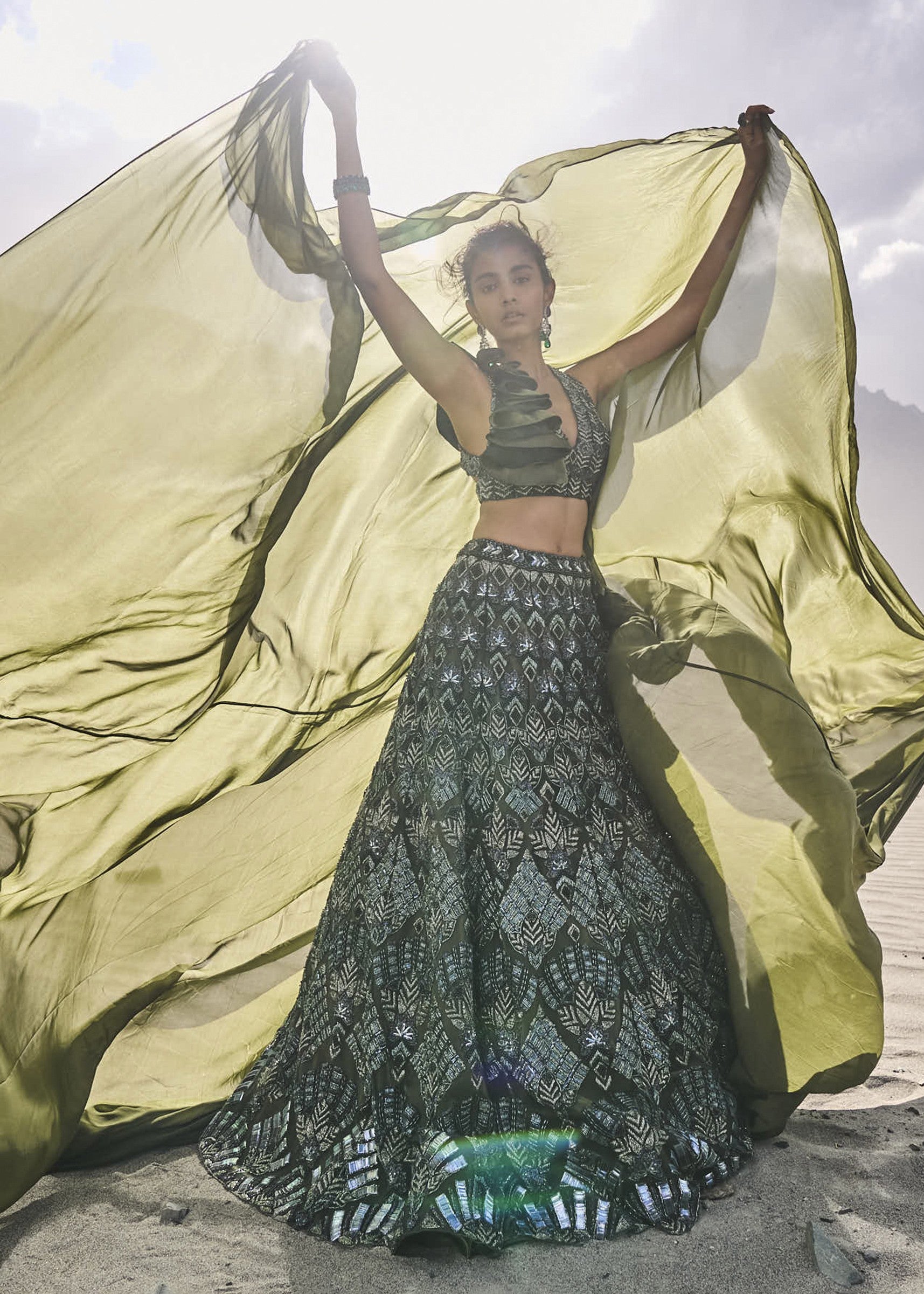 Discover unparalleled elegance with our mehendi green blouse and lehenga set, a celebration of grace and grandeur. The blouse, crafted in luxurious net fabric, showcases a plunging v-neckline adorned with detailed back dori and patti work. An enchanting cape drapes elegantly from one shoulder, adding a touch of opulent flair. The lehenga is a masterpiece of intricate cutdana embroidery, creating a dazzling effect with every movement.