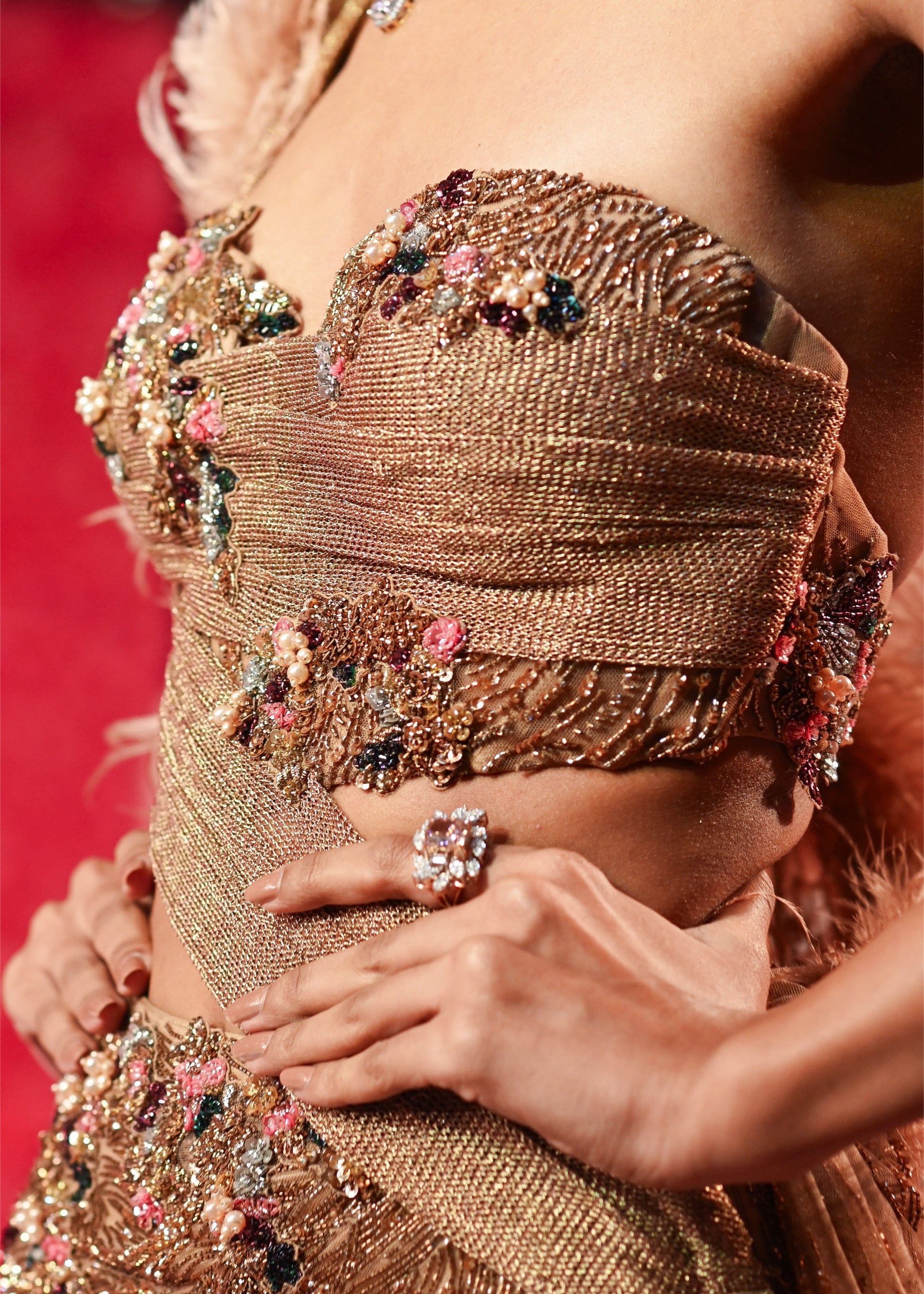 Burnt gold mesh draped sari set accentuated with tulle crystallized skirt and feather accentuated palla.