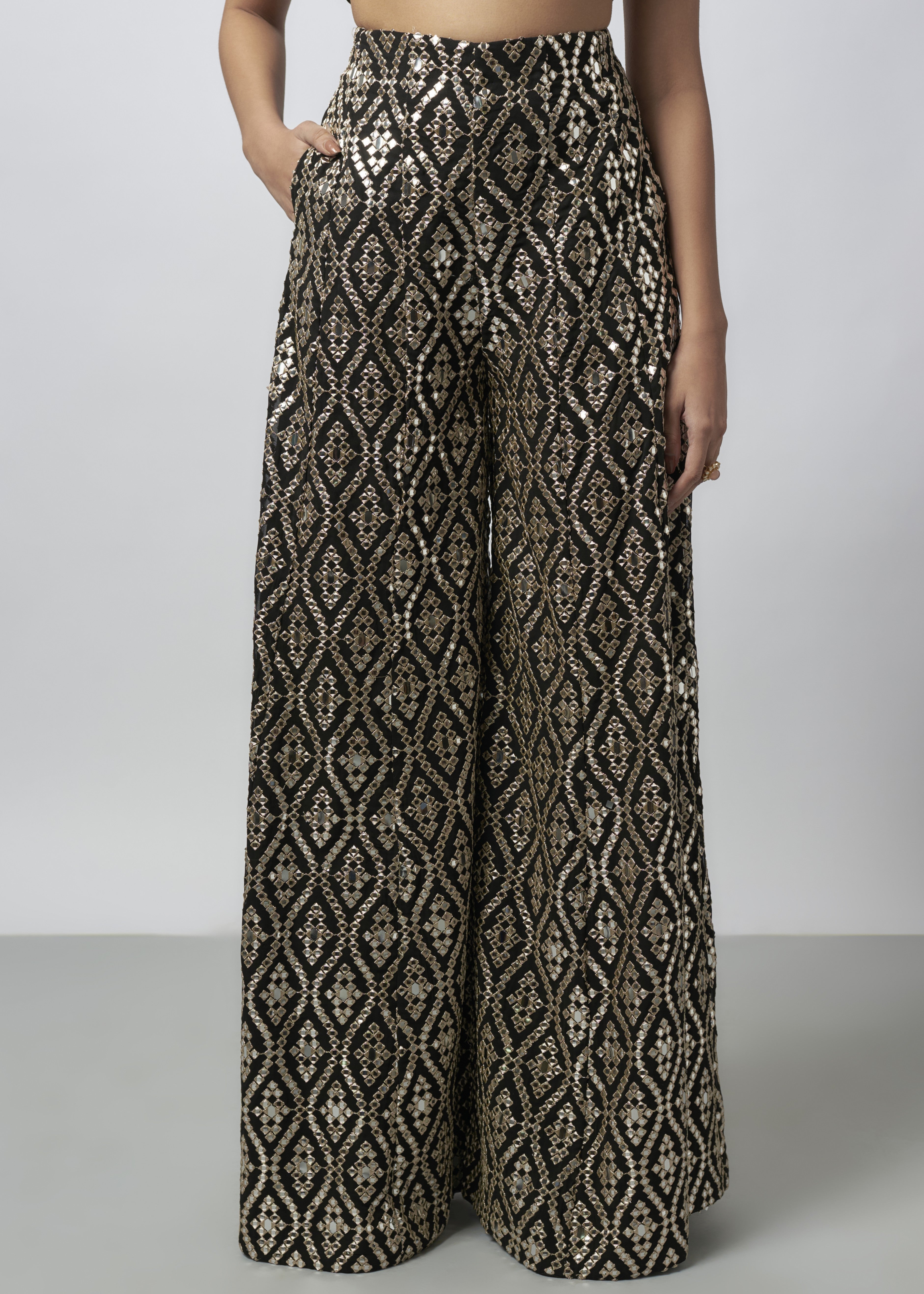 This co-ord set features bralette-style blouse embellished with intricate hand and mirror work . The high-waisted flared pants are covered in geometric pattern. Completed with a cape, adorned with delicate embroidery, scattered motifs and a golden border, adding an elegant touch.
