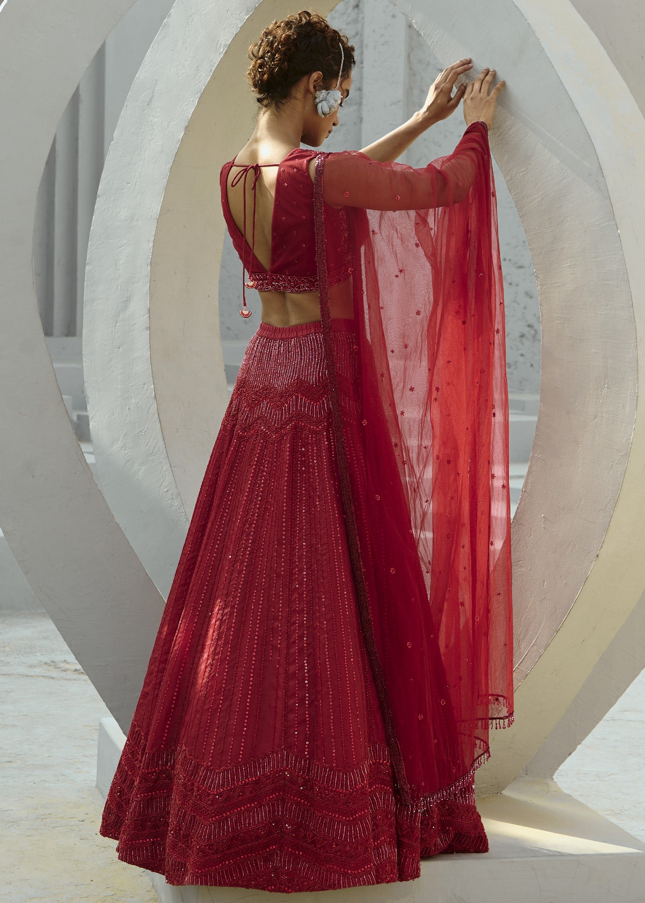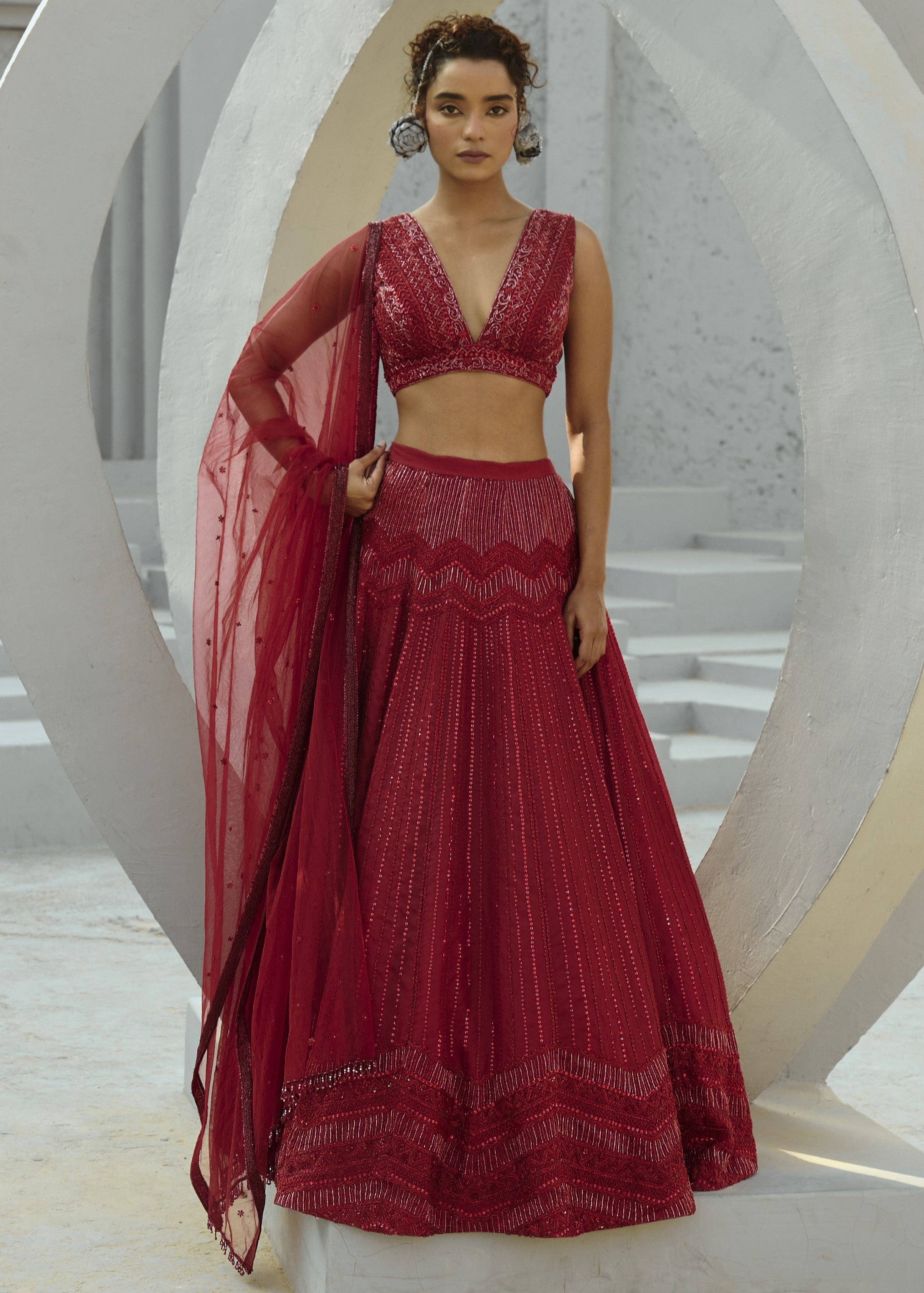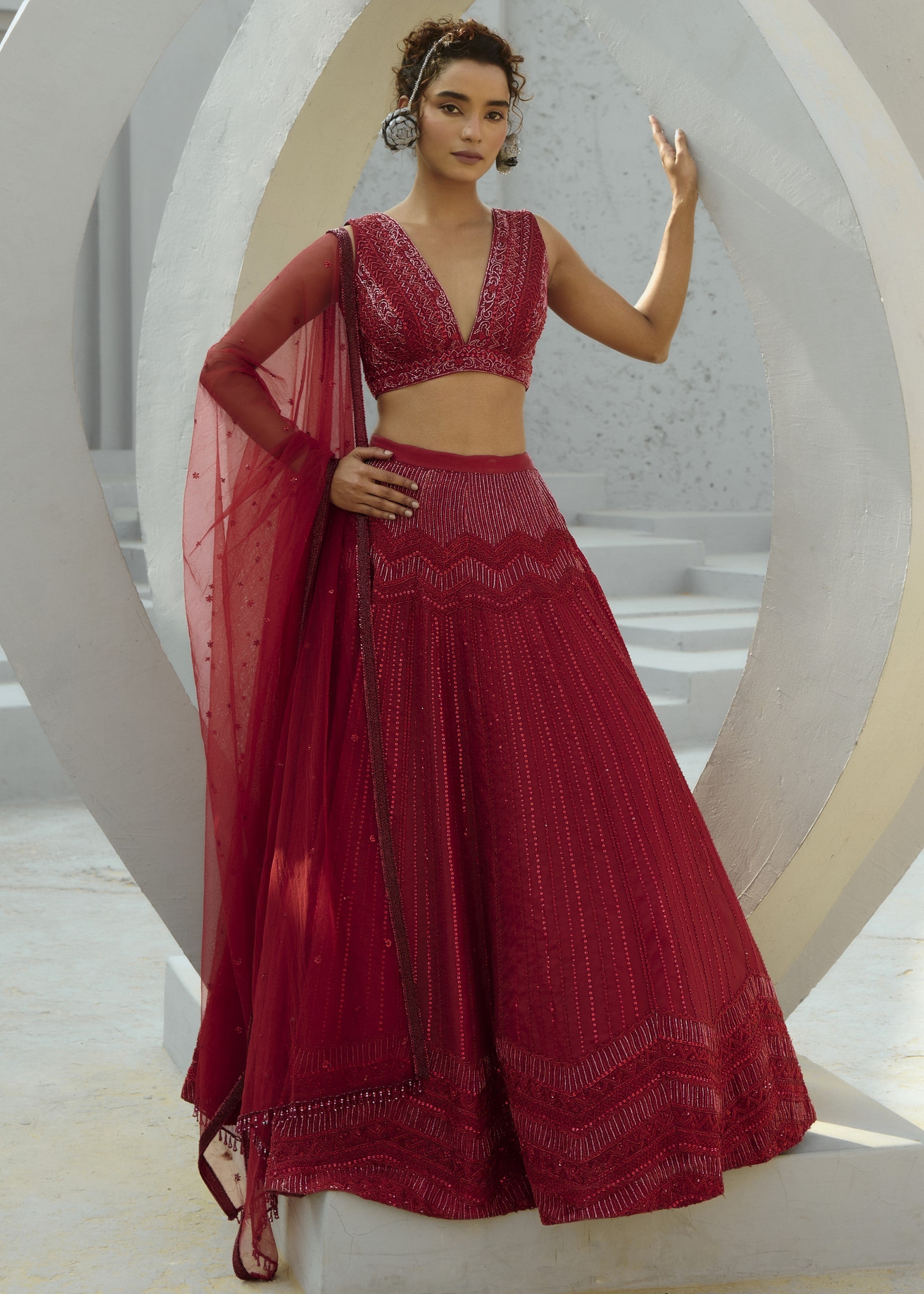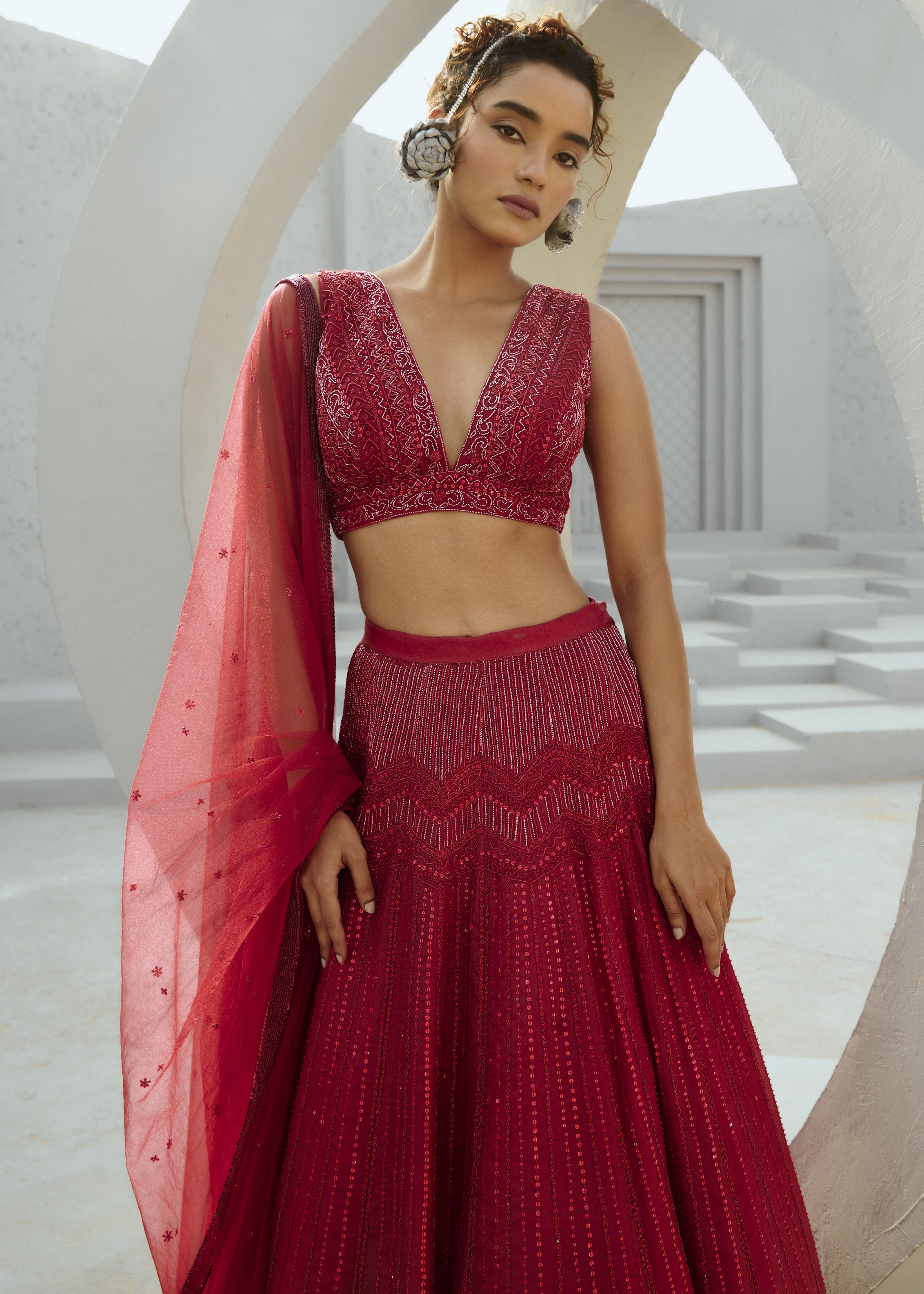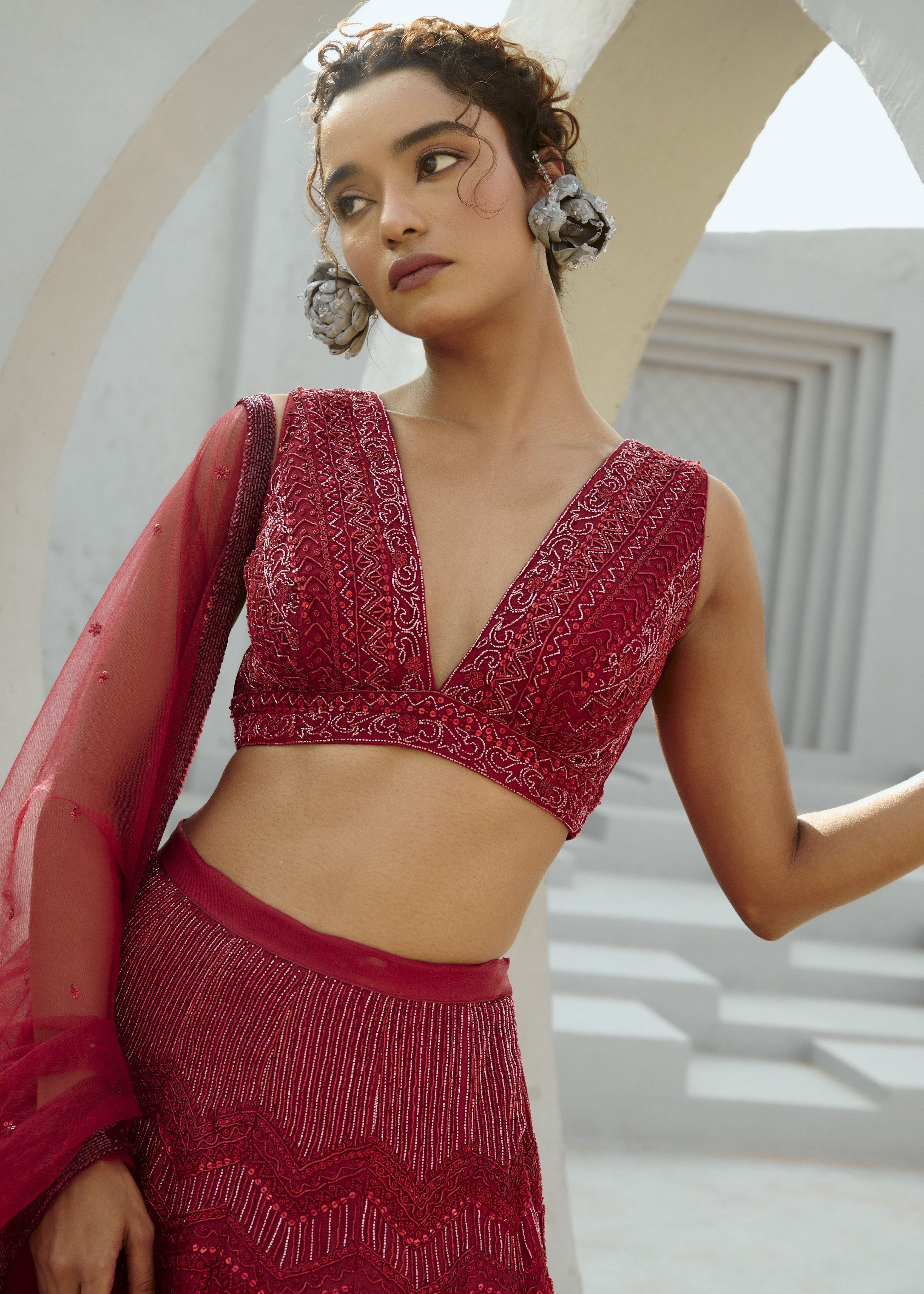 Red glass beads and zari encrusted organza lehenga paired with intricately embellished deep v neck blouse and soft tulle dupatta.